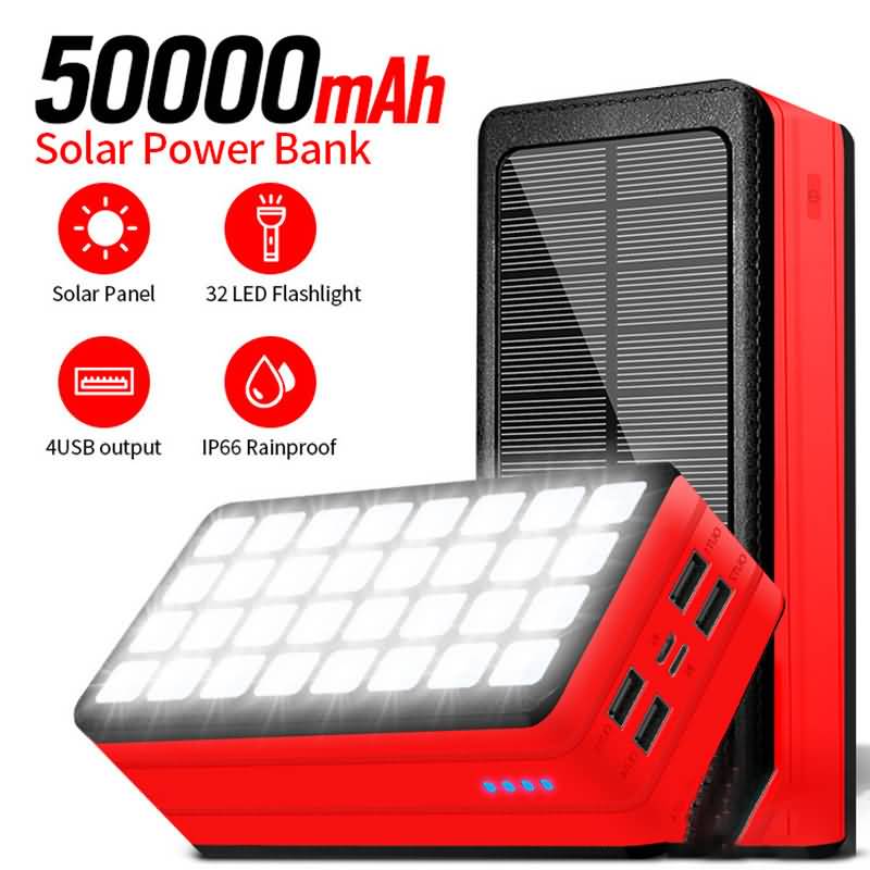 【PSE認証済】 ソーラーバッテリー PS-900 50000mAh 超大容量 軽量 ソーラーチャージャー4台同時充電 2.1A急速充電 32連LED照明ライト搭載 スマホ充電器 モバイル充電器 全6色 SKU:PC01122024010LS